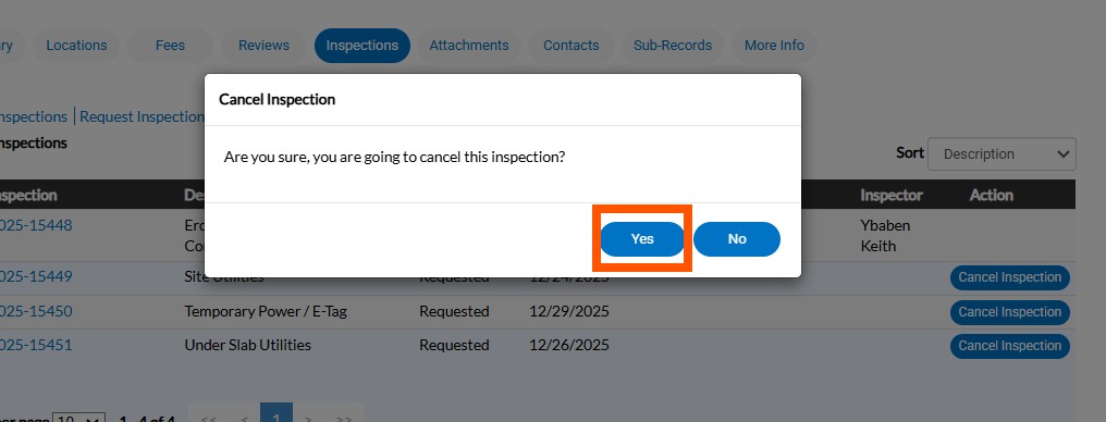 Follow steps 1-4 above. Under the Inspections Tab, find the inspection requested and click the "Cancel Inspection" to cancel it.