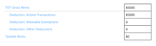 If reporting on the Tax Collector’s TOT website, for example, you should enter your Gross Rents (All rental income, including Airbnb) and then subtract out any deductions (including Airbnb) using the website interface.
