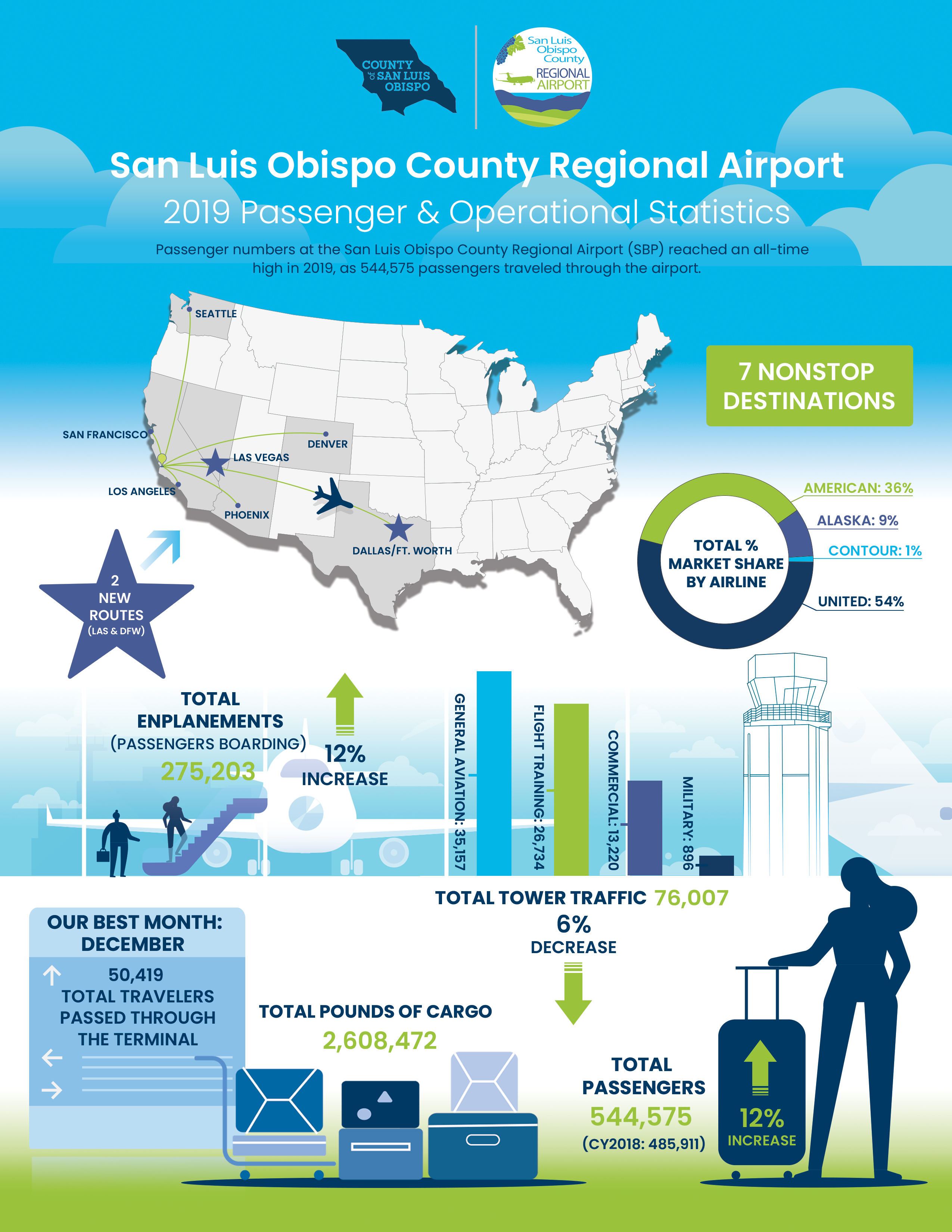 SAN LUIS OBISPO, CA — Passenger numbers at the San Luis Obispo County Regional Airport (SBP) reached an all-time high in 2019, as 544,575 passengers traveled through the airport. The amount is 12 percent higher than 2018’s 485,911 traveler count and sets the record for the most annual passengers in the airport’s history. Previously, 2018 was the airport’s busiest year on record.