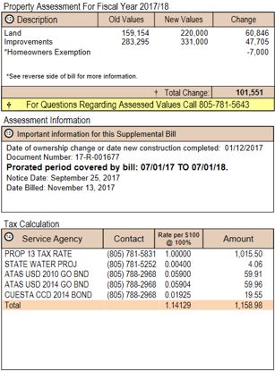 - For questions regarding values or the reason for this Supplemental Tax Bill, please contact the County Assessor's Office at 805-781-5643.