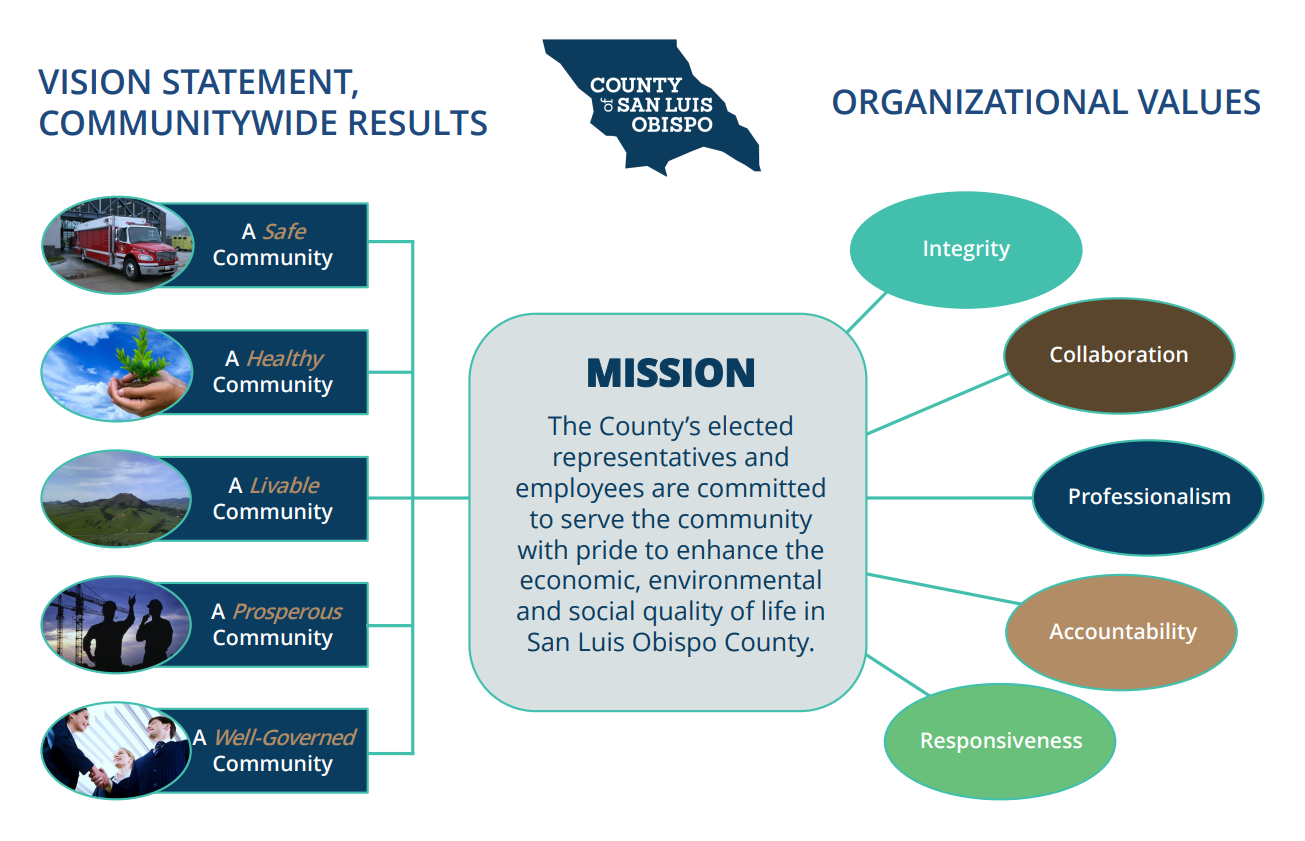 Mission: The County's elected representatives and employees are committed to serve the community with pride to enhance the economic, environmental and social quality of life in San Luis Obispo County.