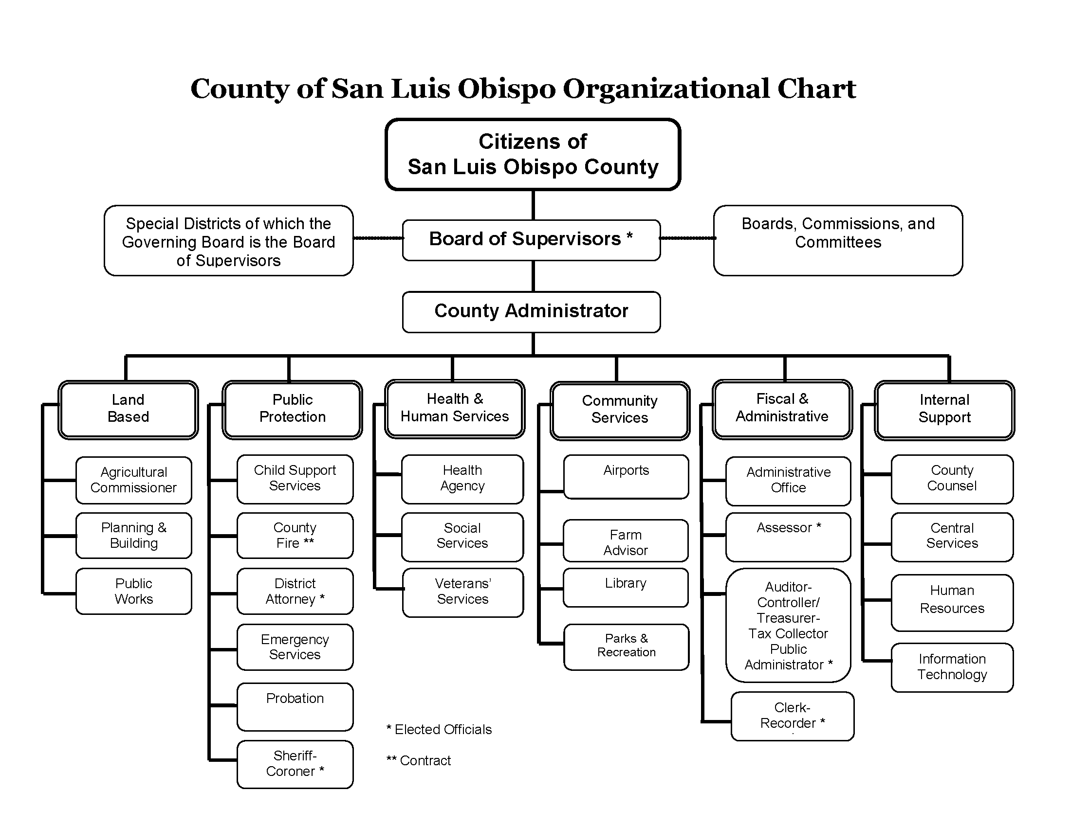 The County of San Luis Obispo government (The County) is a general law form of government, which means that certain aspects of the structure and functioning of the County are dictated by State law.