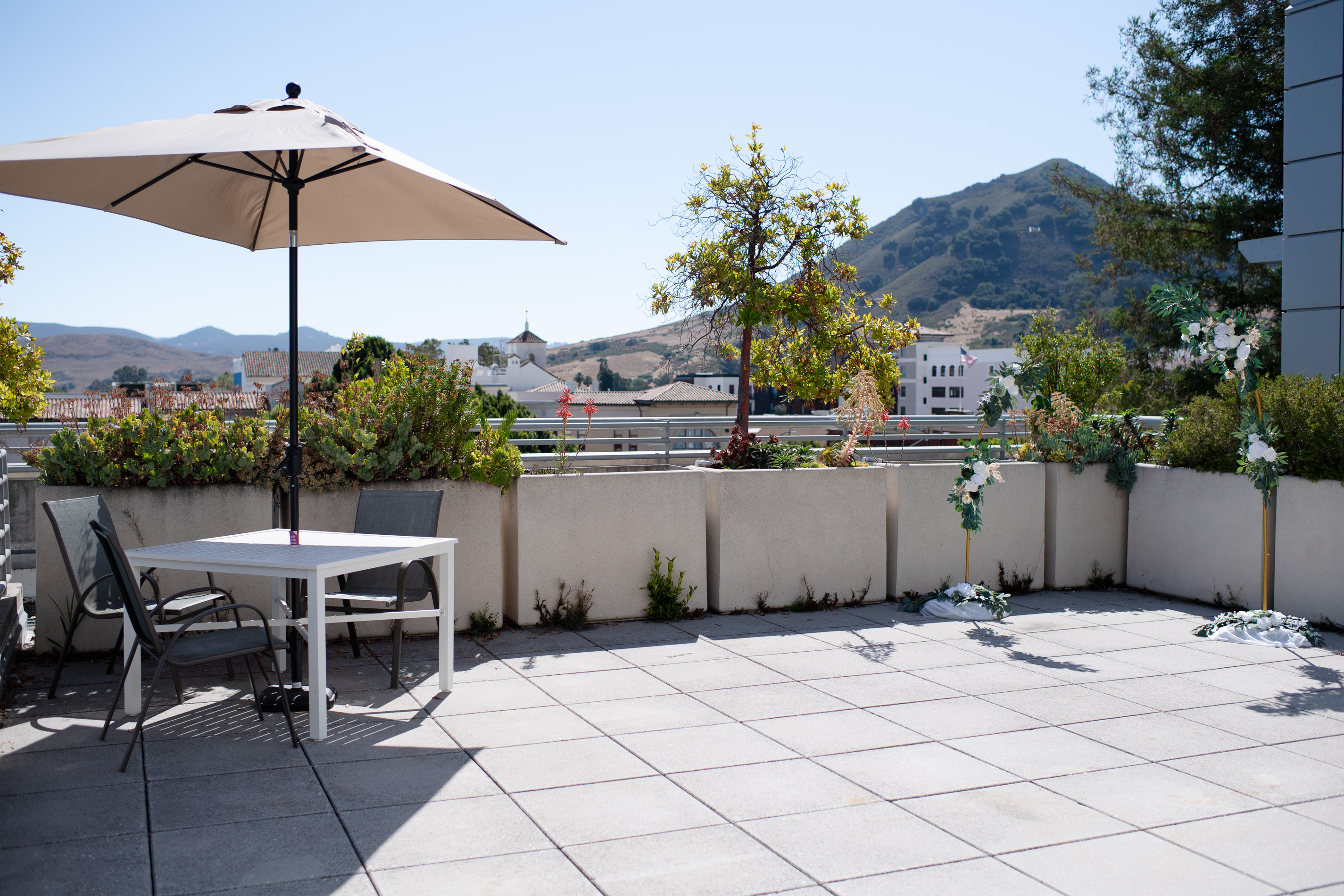 Discover our new seasonal rooftop ceremony service! Our rooftop overlooks the beautiful Cerro San Luis Mountain and features surrounding downtown views. Our rooftop can host groups up to 30 guests standing. The allotted time is 30 minutes from the scheduled service, accommodating the ceremony and allowing for photographs with guests. Seating is limited, with approximately 4 seats available, and shade is limited as well.