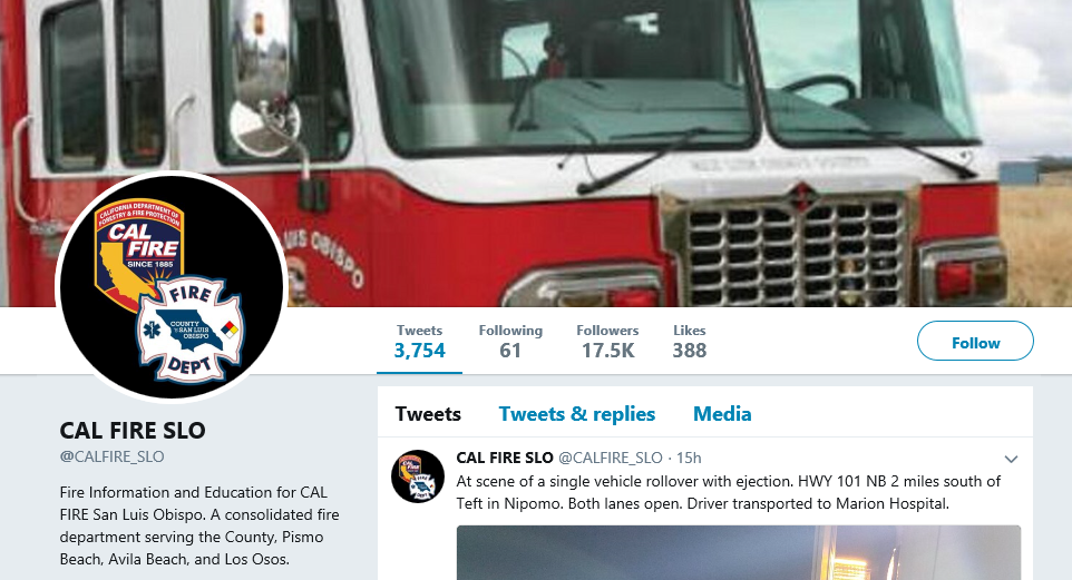 The County Fire Department (CAL FIRE SLO) uses Twitter to provide real-time updates in incidents as they happen.