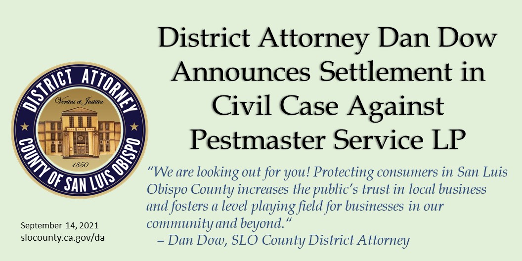 Today, San Luis Obispo County District Attorney Dan Dow announced that his office, along with 16 other District Attorney’s Offices in California, resolved a civil case involving pesticide violations and unfair business practices against Jeffrey M. Van Diepen and Pestmaster Services LP (formerly known as Pestmaster Services Inc.). The stipulated judgement requires the defendants to pay $575,000 in penalties and costs and requires them to contract out training for their employees, give prior notice to county officials of pesticide applications, hire an outside compliance manager, and other requirements to ensure their compliance with the law. Mr. Van Diepen was required to surrender his California pest control licenses and is barred from ever performing this work in the future.