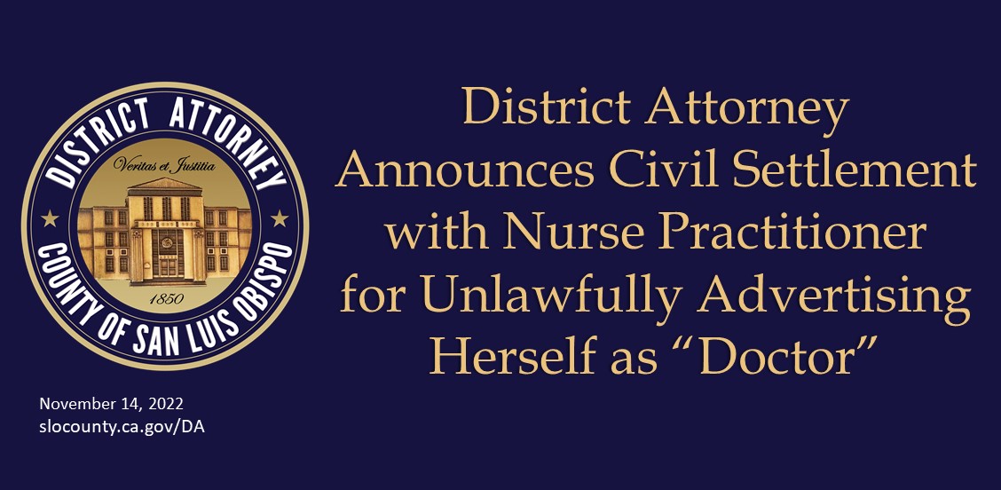 District Attorney Dan Dow Announces Settlement with Arroyo Grande Nurse for Unlawfully Advertising Herself as “Doctor”