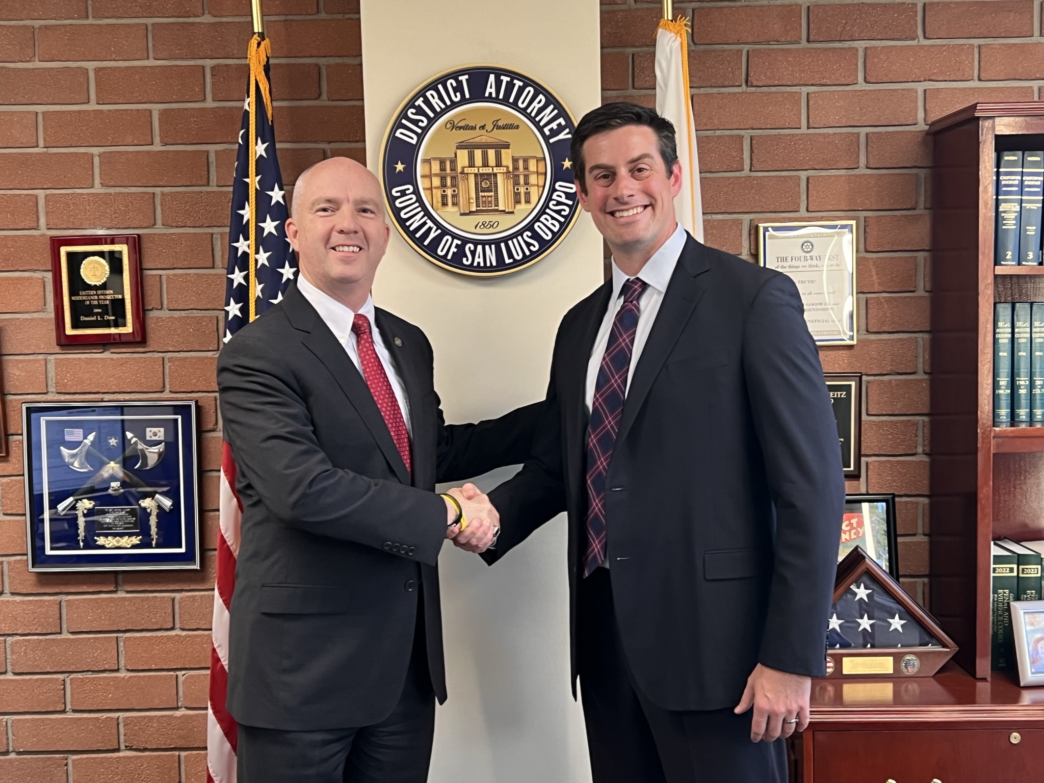 District Attorney Dan Dow congratulates DDA Chris Peuvrelle on his appointment as Supervising Attorney in Monterey County.