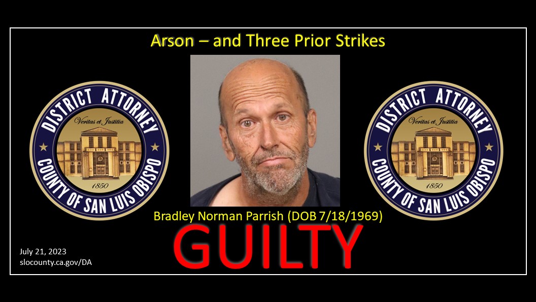 District Attorney Dan Dow announced today, July 21, 2023, that a San Luis Obispo County jury has found Bradley Norman Parrish (54) guilty of aggravated arson of forest land after a week long trial.