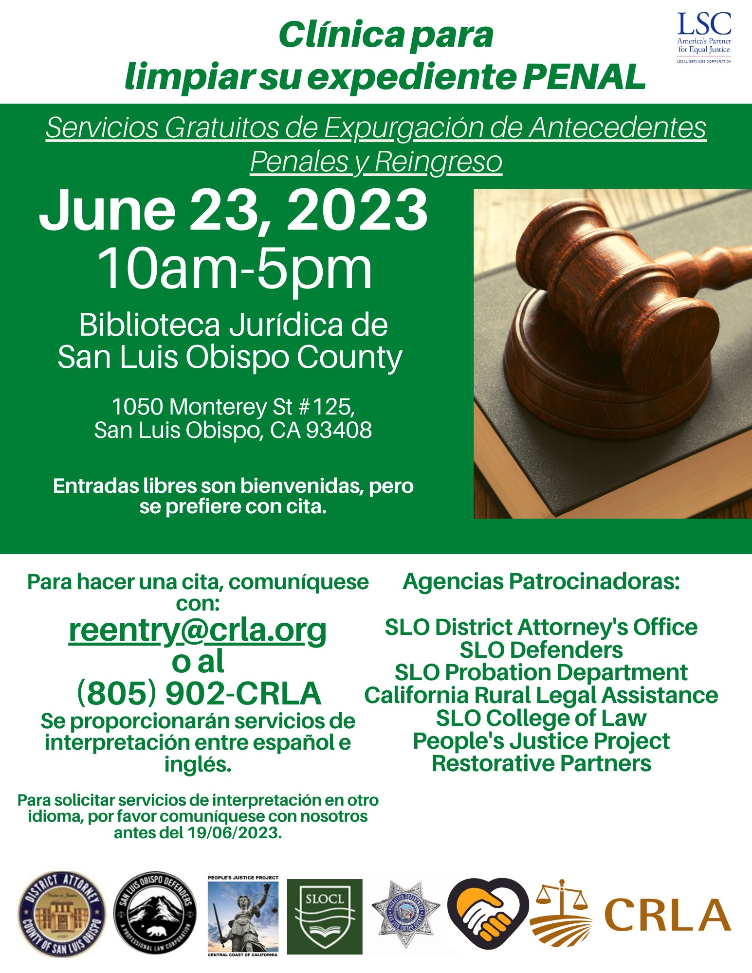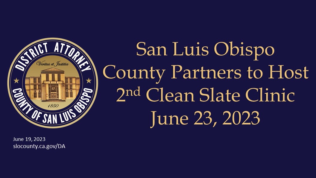 The San Luis Obispo County District Attorney’s Office, San Luis Obispo County Probation Department, San Luis Obispo Defenders, Restorative Partners, People’s Justice Project, California Rural Legal Assistance, and San Luis Obispo College of Law will host a free legal Clean Slate Clinic for San Luis Obispo County residents for criminal record expungement, felony reduction, and arrest record sealing on Friday, June 23, 2023 from 10 a.m. to 5 p.m. at the SLO County Law Library located at 1050 Monterey Street # 125, San Luis Obispo, CA 93408.