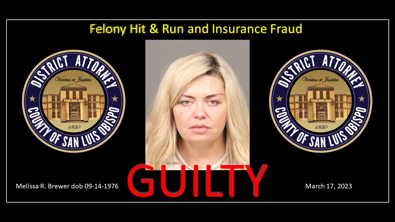 District Attorney Dan Dow announced today that on Thursday, March 16, 2023, a San Luis Obispo County Jury convicted 46-year-old Melissa Roseanne Brewer, of San Miguel, for felony hit and run causing injury to a motorcyclist. Brewer was also convicted of four felony counts of insurance fraud and one misdemeanor count of reckless driving.