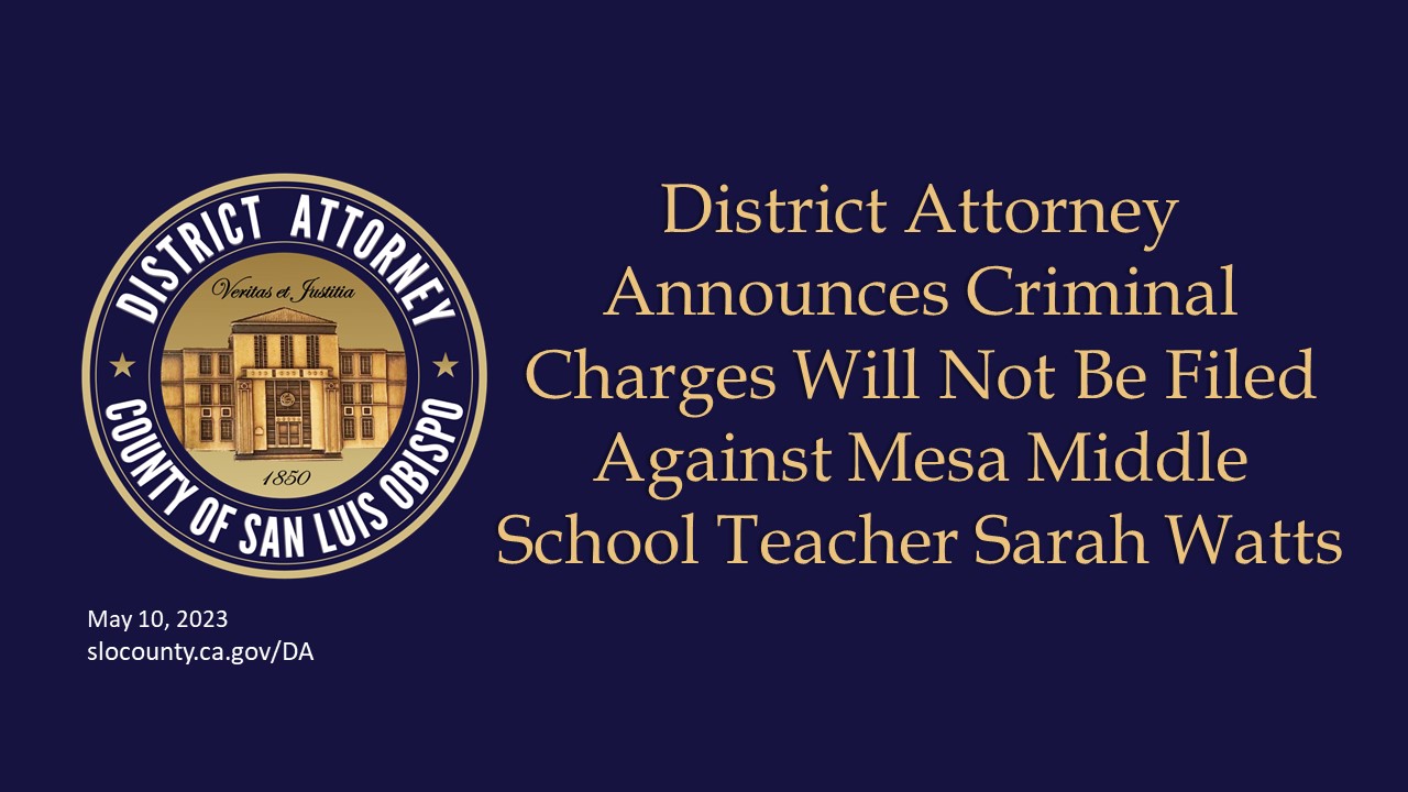 A Mesa Middle School math teacher who was arrested on campus by the San Luis Obispo County Sheriff’s Office on Tuesday, April 25, 2023 will not be charged. The incident was referred to the District Attorney’s Office with a recommendation to charge Ms. Watts with felony child abuse causing injury.