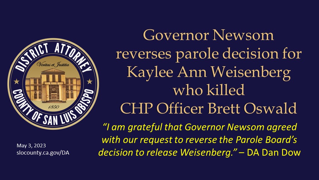 After DA Dow urged in writing, Governor Newsom has reversed the Board of Parole Hearings' earlier decision to release Kaylee Ann Weisenberg who was convicted and sentenced to prison for the 2010 brutal killing of California Highway Patrol Officer Brett Oswald (48).