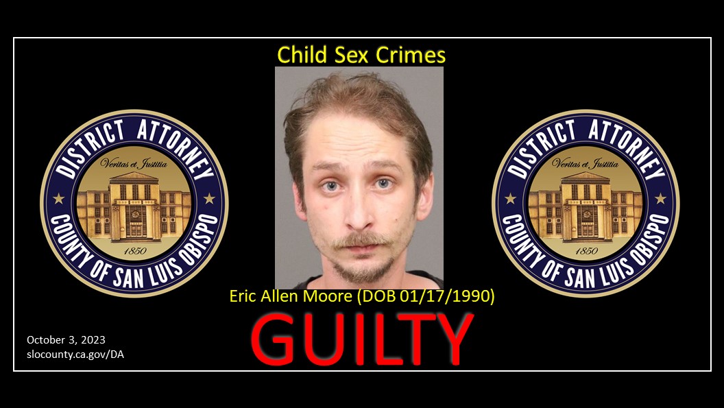 Eric Allen Moore (33) of Paso Robles has pleaded guilty to two counts of engaging in sex acts with a child under the age of 10. In his plea to the court, Moore admitted two aggravating factors including that the crimes involved victims who were particularly vulnerable and that he took advantage of a position of trust or confidence when he committed the crimes.