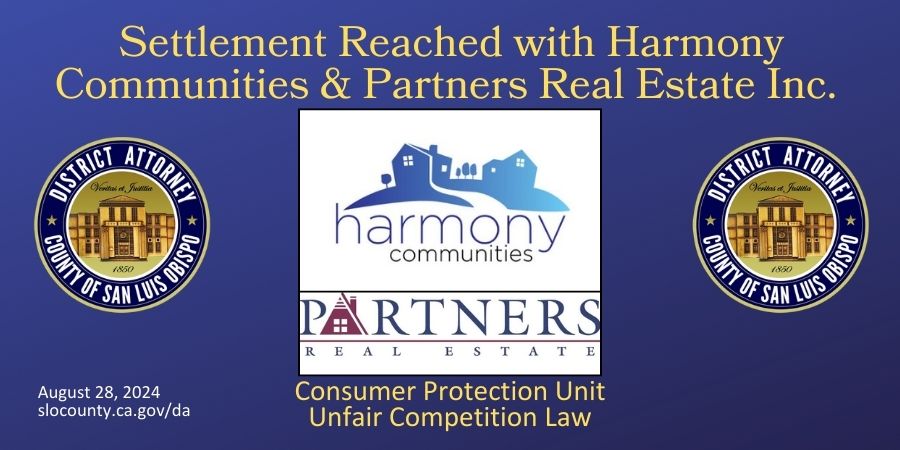 The San Luis Obispo County District Attorney’s Office Consumer Protection Unit has settled with the property management company, Harmony Communities, Inc., and its associated real estate brokerage company, Partners Real Estate, Inc. Harmony Communities, Inc. Harmony manages South Peak Mobile Home Park located on South Street in San Luis Obispo, along with more than 50 other mobile home parks in California.
