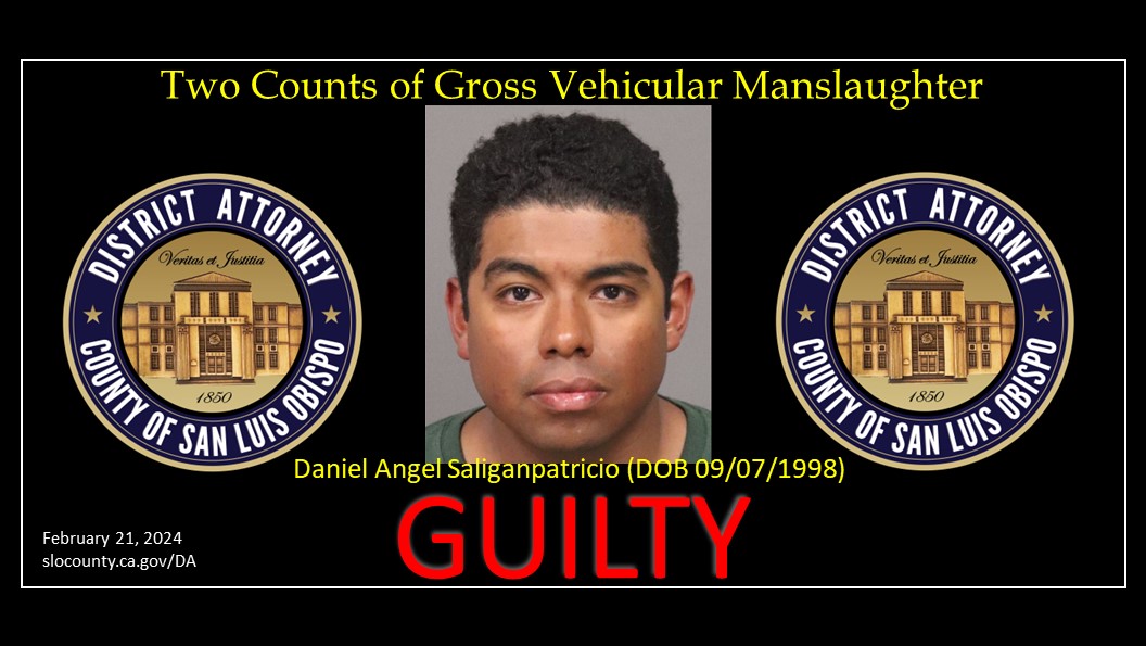 District Attorney Dan Dow announced today that San Luis Obispo City resident Daniel Angel Saliganpatricio (DOB 09/07/1998) has pleaded guilty to two counts of gross vehicular manslaughter, both are felonies.