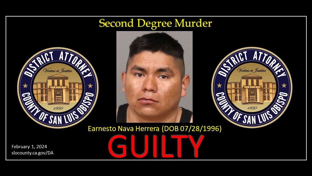 District Attorney Dan Dow announced today that a San Luis Obispo County jury has convicted Earnesto Nava Herrera (07/28/1996) of murder, gross vehicular manslaughter while intoxicated, hit and run causing death, driving while under the influence of alcohol causing great bodily injury, and driving on a suspended license.