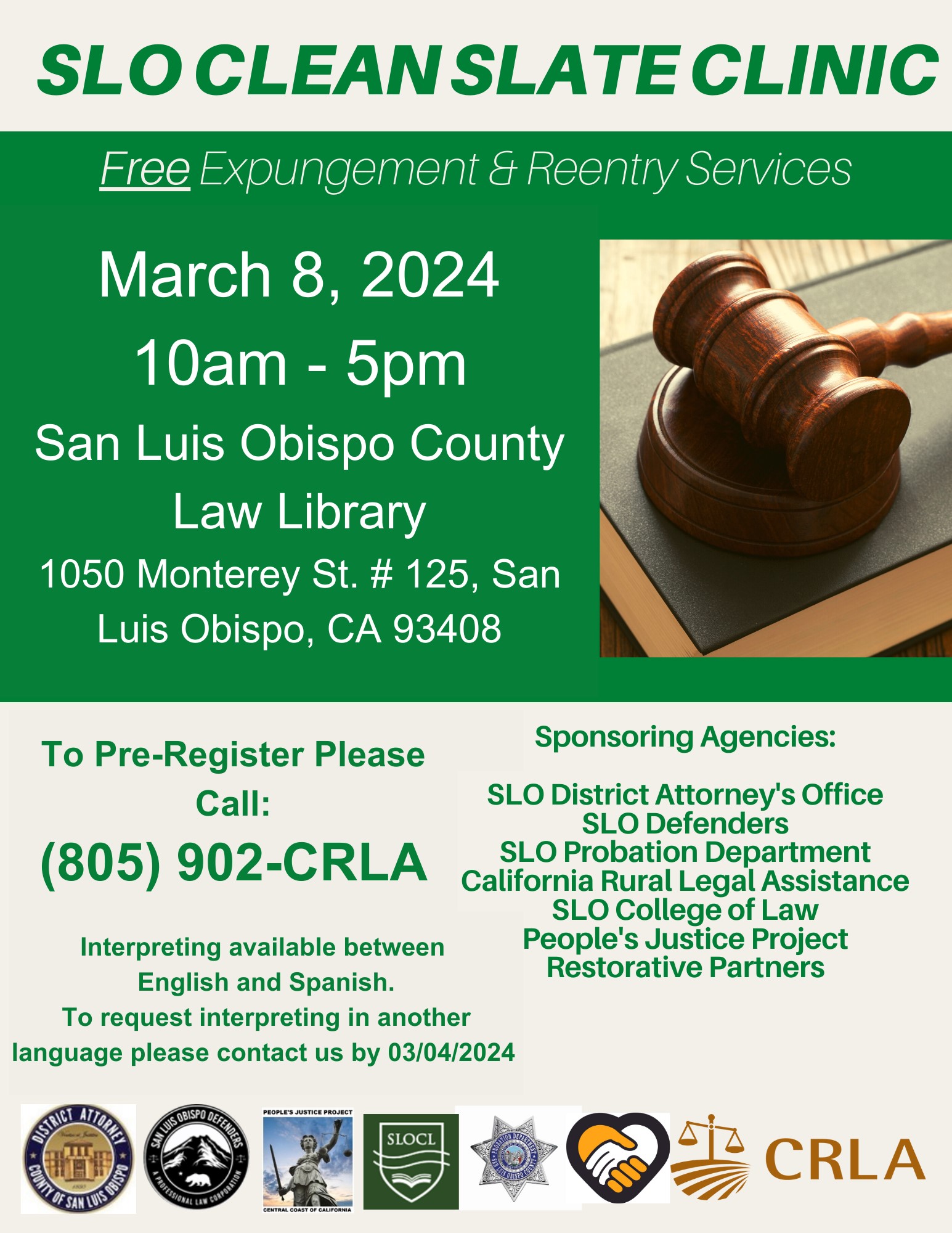 The San Luis Obispo County District Attorney’s Office, San Luis Obispo County Probation Department, San Luis Obispo Defenders, Restorative Partners, People’s Justice Project, California Rural Legal Assistance, and San Luis Obispo College of Law will host a free legal Clean Slate Clinic for criminal record expungement, felony reduction, and arrest record sealing on Friday, March 8, 2024 from 10 a.m. to 5 p.m. at the SLO County Law Library located at 1050 Monterey Street # 125, San Luis Obispo, CA 93408.