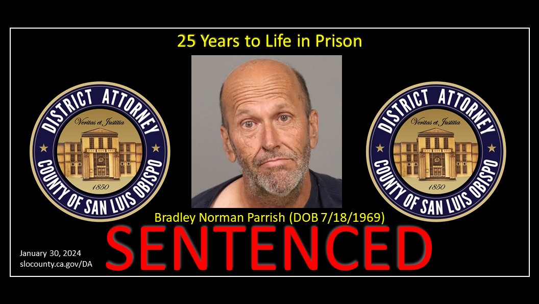 On Thursday January 25, 2024, a San Luis Obispo County Superior Court Judge sentenced Bradley Norman Parrish (07/18/1969) to serve 25 years to life in state prison for his conviction of aggravated arson with four previous convictions for arson.