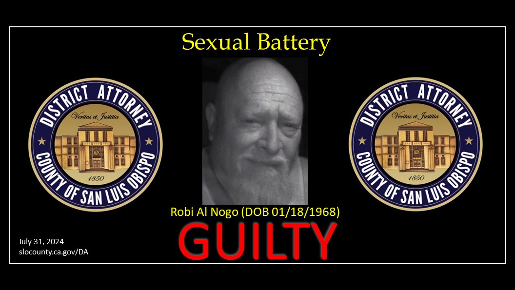 District Attorney Dan Dow announced today that a San Luis Obispo County jury found Robi Al Nogo (DOB 01/18/1968) of Paso Robles guilty of one count of Misdemeanor Sexual Battery against his female Uber driver.