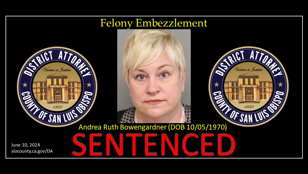 District Attorney Dan Dow announced today that Burbank resident Andrea Ruth Bowengardner (DOB 10/05/1970) has been sentenced to felony probation and 1,040 hours of community work service following her pleas of no contest on March 27, 2024, to three felony counts of embezzlement, and one felony count of passing a check with insufficient funds.