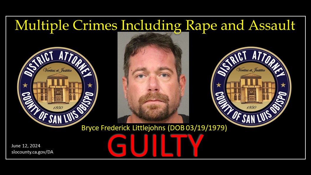 District Attorney Dan Dow announced that on Tuesday June 11, 2024, a San Luis Obispo County jury found Bryce Littlejohns (45) of Oceano, CA, guilty of numerous crimes he viciously committed against his former spouse in March 2020, and related crimes against law enforcement.