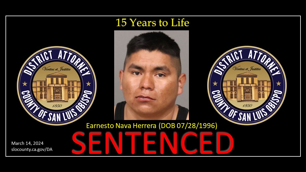 District Attorney Dan Dow announced today that Earnesto Nava Herrera (DOB 07/28/1996) has been sentenced to 6 years 8 months plus 15 years to life for the murder, hit and run causing death, driving while under the influence of alcohol causing great bodily injury, and driving on a suspended license.