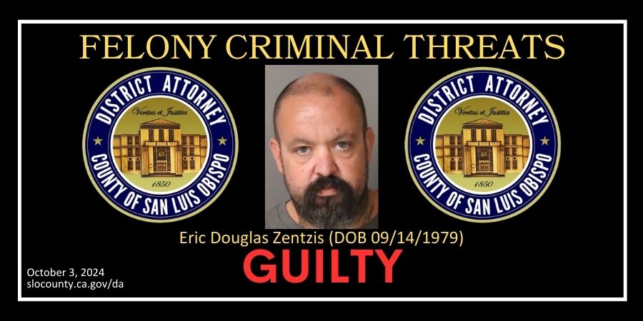 District Attorney Dan Dow announced today that a San Luis Obispo County jury convicted Eric Douglas Zentzis (DOB 09/14/1979) of making felony Criminal Threats.