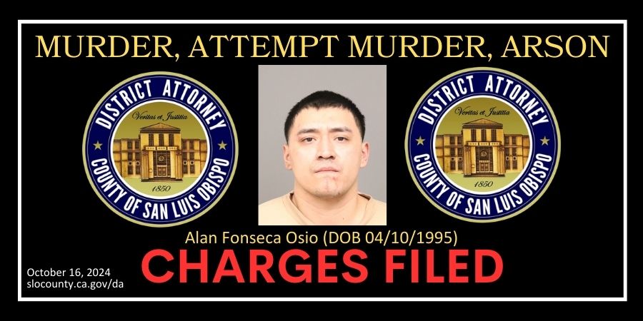 The Office of the District Attorney filed criminal charges today against Alan Fonseca Osio (29) for the crimes of murder, attempted murder, arson, and assaulting a police animal on October 14, 2024 at his parents residence in Arroyo Grande.