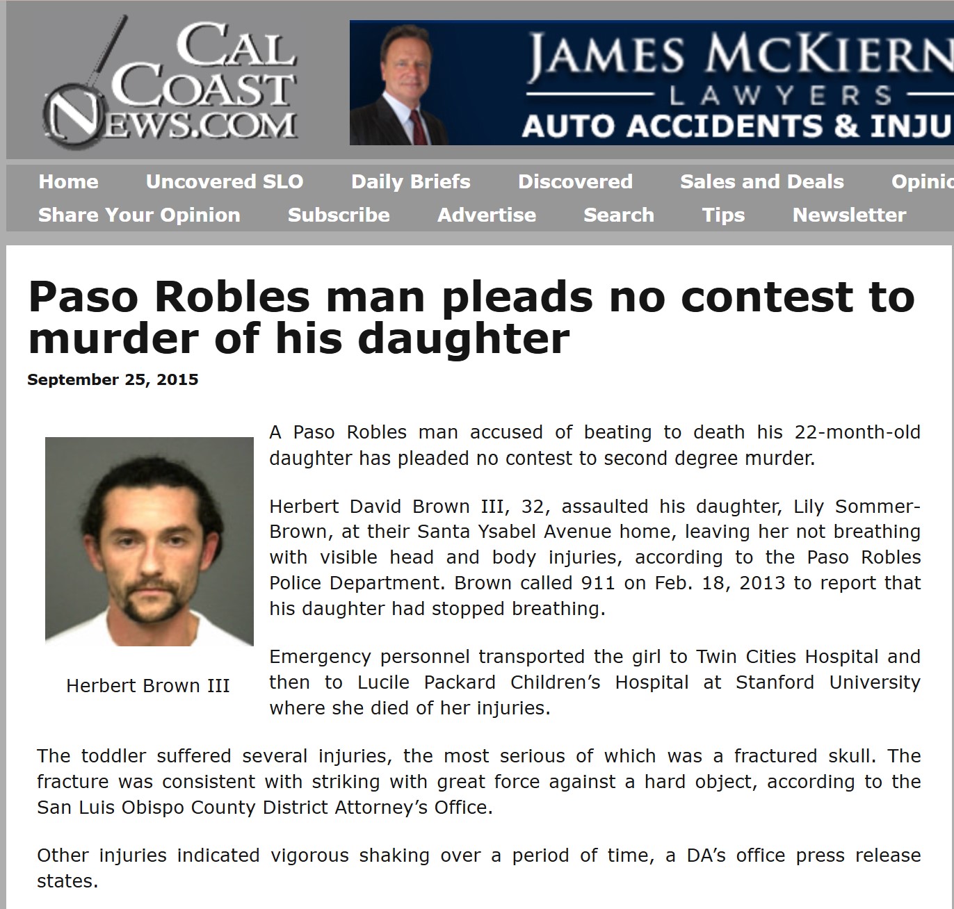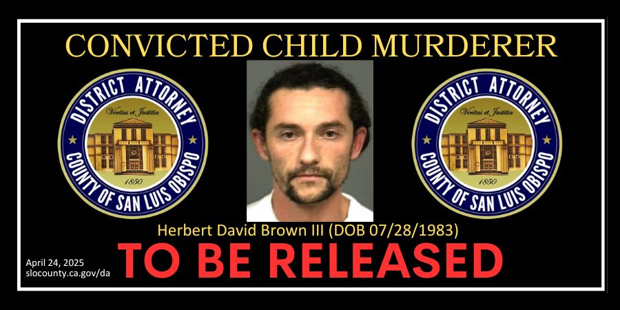 On April 22, 2025, the California Department of Corrections and Rehabilitation (CDCR) Parole Board affirmed their 2024 decision to grant early parole to convicted child murderer Herbert David Brown III (DOB 07/28/1983) of Paso Robles. Brown entered a plea of no contest in 2015 to the brutal beating murder in 2013 of his 22-month-old daughter Lily. Brown was sentenced to serve 15 years to life in state prison and has only served 12 years to date.