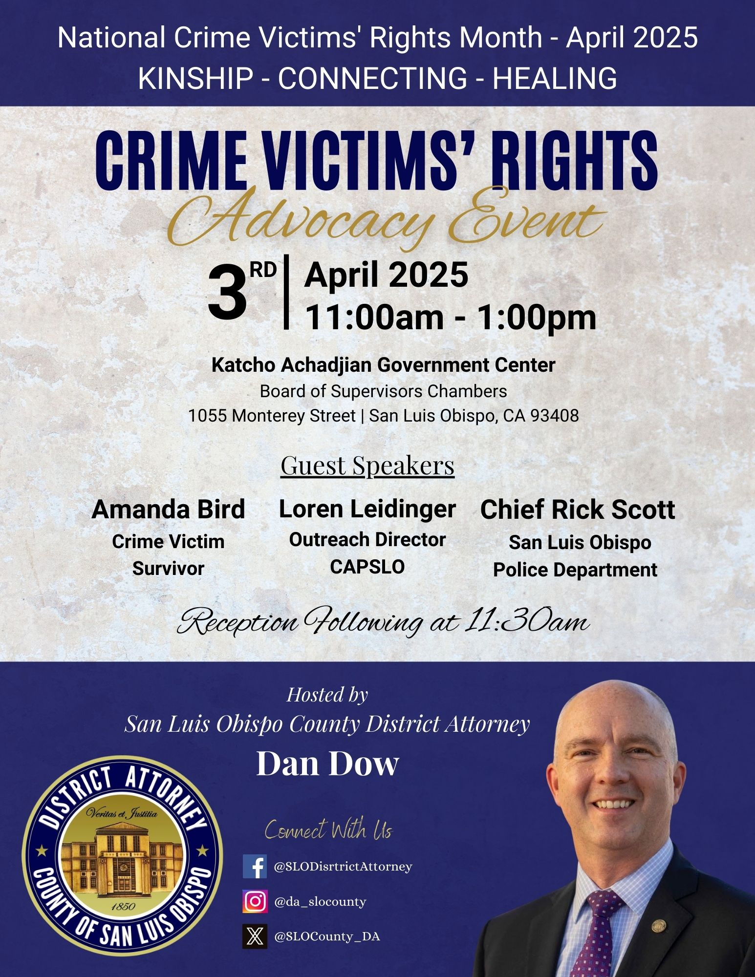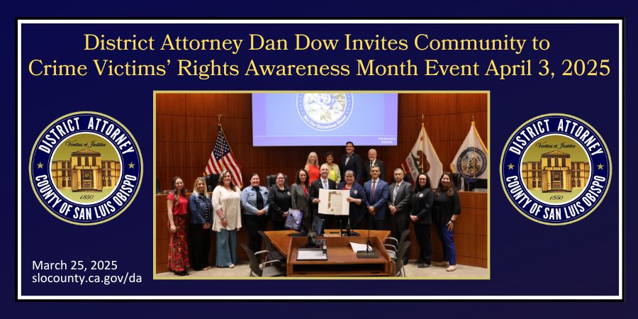 Today, the Board of Supervisors proclaimed the month of April as “Crime Victims’ Rights Awareness Month in San Luis Obispo County.” And in anticipation of this year's upcoming National Crime Victims’ Rights Week (NCVRW) April 6 - 12, 2025, District Attorney Dan Dow is hosting a community event open to the public on Thursday, April 3rd at 11:00 am.