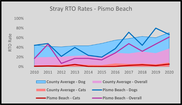 Represents the owner reclaim rate for stray animals brought into the Animal Services shelter from Pismo Beach. The countywide average reclaim rate for each animal type is represented by the shaded area.