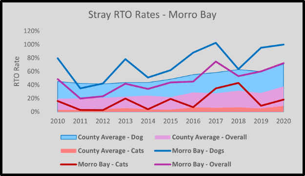 Represents the owner reclaim rate for stray animals brought into the Animal Services shelter from Morro Bay. The countywide average reclaim rate for each animal type is represented by the shaded area.