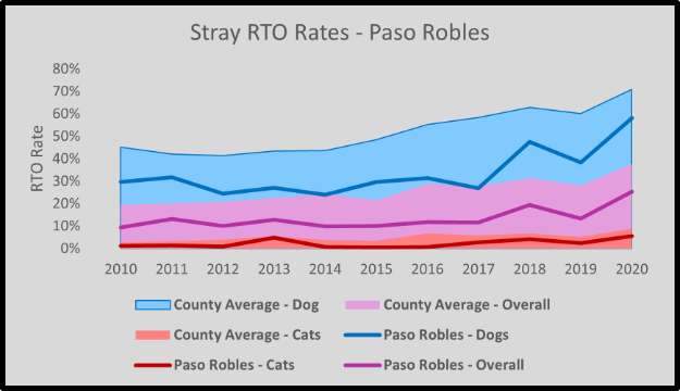 Represents the owner reclaim rate for stray animals brought into the Animal Services shelter from Paso Robles. The countywide average reclaim rate for each animal type is represented by the shaded area.