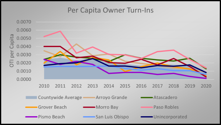 Represents the number of animals surrendered to the Animal Services shelter by owners relative to the population of each of the county's seven cities and of the unincorporated areas. This allows for a direct comparison of stray animal intake rates between cities of different populations and sizes. The overall countywide average rate of owner surrenders is represented by the shaded area.