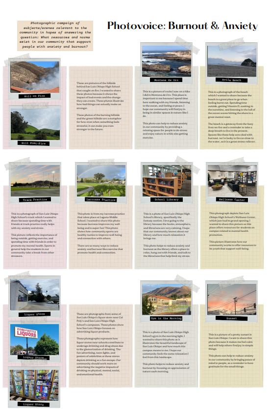 The Friday Night Live chapter at San Luis Obispo High School has been working on reducing anxiety and burnout and highlighting assets in the community that support this goal through a project called Photovoice. Photovoice is a campaign in which participants capture their voices and express their point of view by photographing subjects and scenes relevant to their communities in hopes of answering the question: What resources and norms exist in our community that support people with anxiety and burnout? FNL members then wrote a narrative for each photo sharing what the photo means to them and what it tells us about anxiety/burnout in our community.