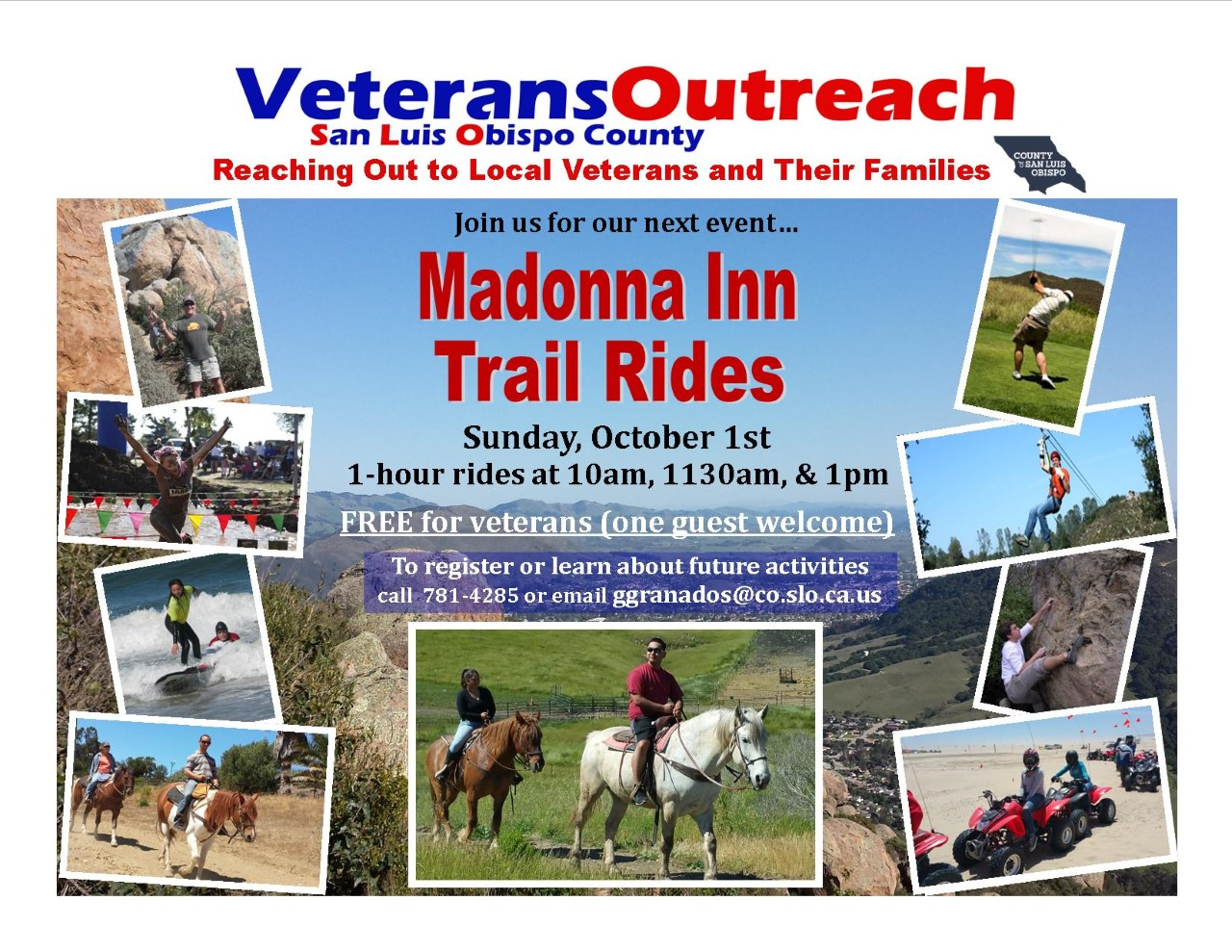 San Luis Obispo – 50 local military veterans and family members are set to enjoy horseback riding with Madonna Inn Trail Rides (100 Madonna Road) on Sunday, October 1 from 10:00am to 1:00pm. This marks five years of the County of San Luis Obispo’s Veterans Outreach hosting activities and connecting veterans and their families to mental health resources in the community.