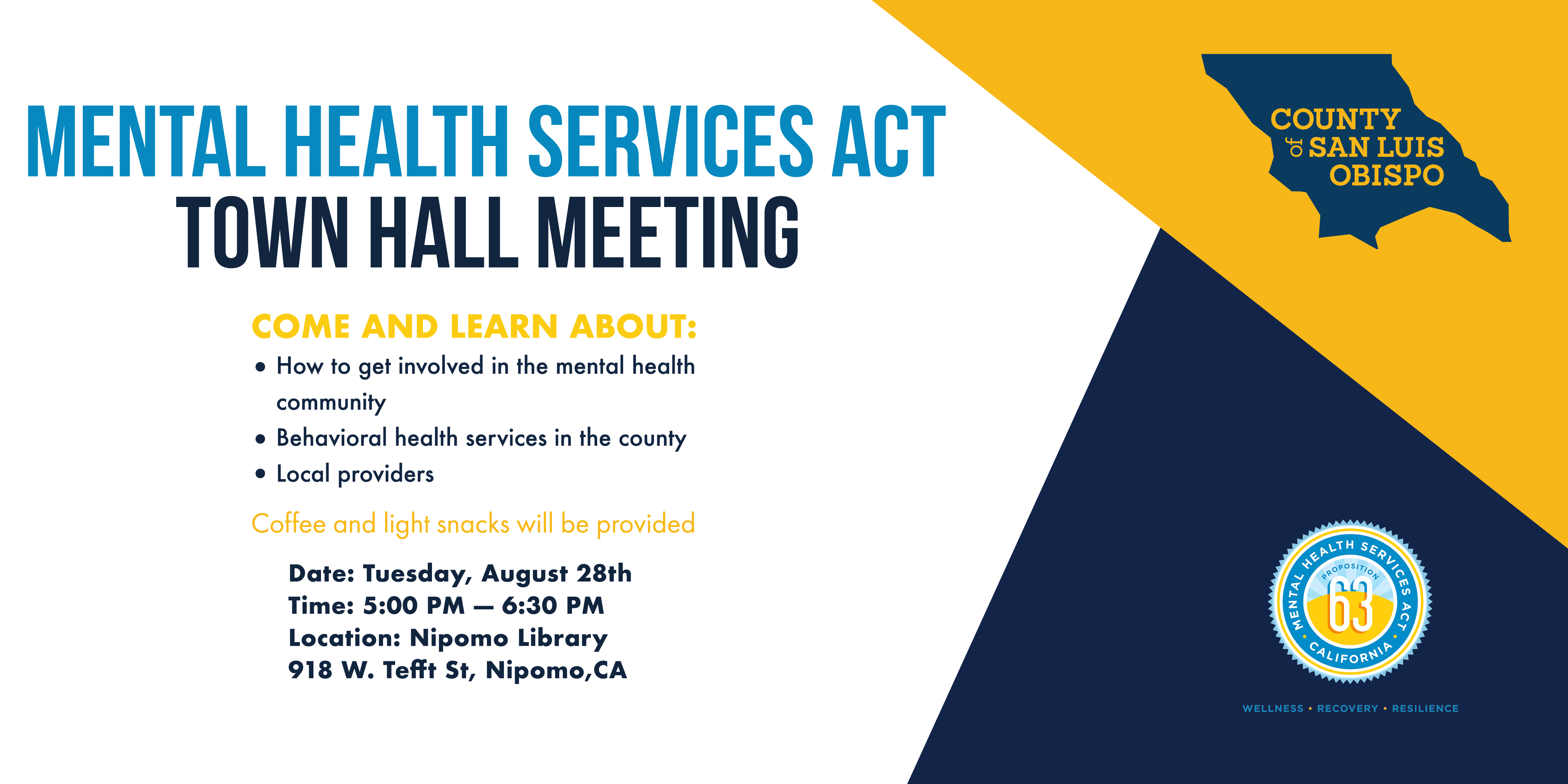 The County’s Mental Health Services Act (MHSA) programs and plans will be the focus of a town hall presentation and meeting on Tuesday, August 28, 5:00-6:30pm at Nipomo’s Community Library (918 West Tefft Street).