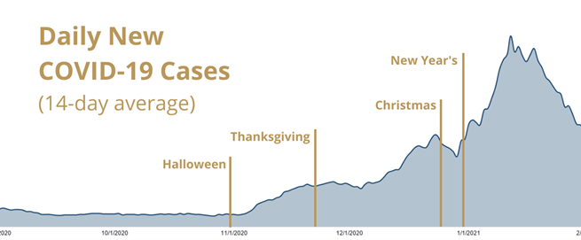 Las infecciones por COVID-19 en el condado de San Luis Obispo tienden a aumentar de dos a tres semanas después de los feriados y celebraciones tradicionales. Este fue el caso después de Halloween, Acción de Gracias, Navidad y Año Nuevo. Las investigaciones de contactos muestran que las reuniones de familiares y amigos continúan alimentando la transmisión del virus tanto a nivel local como nacional.