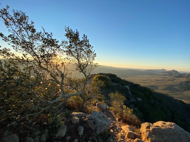 Twilight sky and thick fog rolling into a valley near San Luis Obispo.
