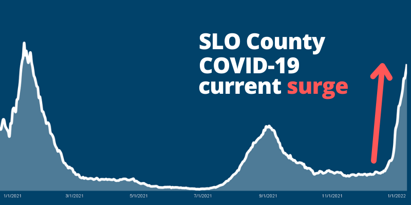 Public Health also reported today that 1,121 new cases of COVID-19 have been confirmed since Friday. SLO County’s 14-day daily average has spiked to 283, up from 34 just before Thanksgiving. Test positivity has increased to 19.2%, higher than the previous peak of 11.1% in January 2021.