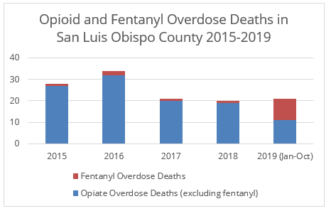 The Public Health Department has confirmed an alarming increase in deaths from fentanyl overdose in San Luis Obispo County. From May to October 2019, ten people have died in SLO County from toxic levels of fentanyl. This compares to two or fewer deaths per year since 2015.