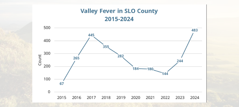 San Luis Obispo, Calif.—More San Luis Obispo County residents were diagnosed with Valley fever in 2024 than any previous year on record, with 482 cases reported to the Public Health Department during the calendar year. This is nearly double the 244 cases reported in 2023 and greater than the previous highest count of 445 cases in 2017.