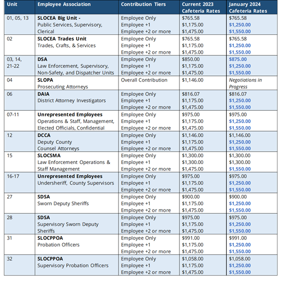 The table below shows the monthly cafeteria contribution amounts by contribution tier for the 2024 calendar year. Any scheduled increases to cafeteria contribution amounts are in blue and bold. These rates are effective the first paycheck of January 2024.