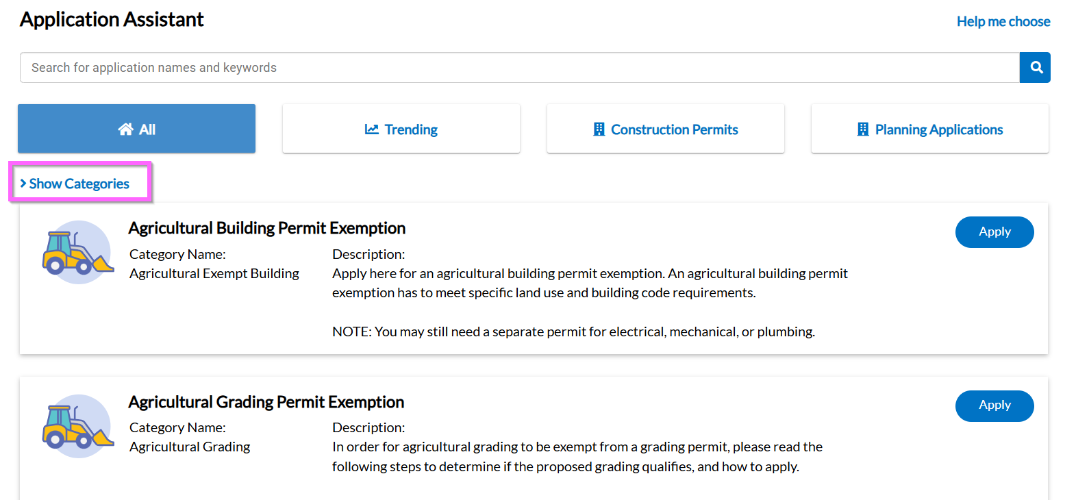 Make sure you are logged into the PermitSLO Portal. This user guide uses a permit as an example application, but the process is similar for other applications. The easiest way to identify which APPLY button to use is to go to our Decision Engine. See link above. Otherwise, you can type the application into a search bar in PermitSLO and find it that way. See guide below: