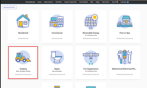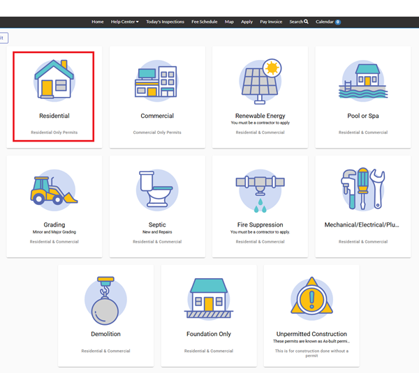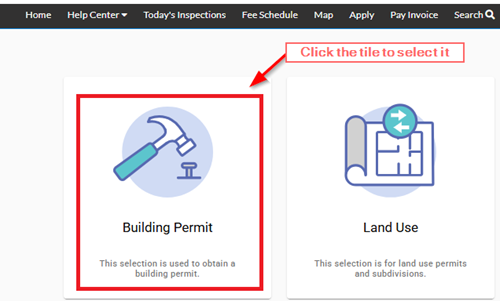 Click either the tile for a Building Permit for a Construction Permit or Land Use for a Planning Application.