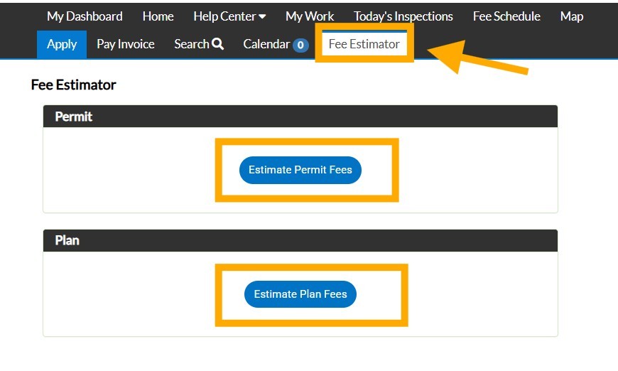 Then choose either Estimate Permit Fees or Estimate Plan Fees. This example uses "Estimate Permit Fees"