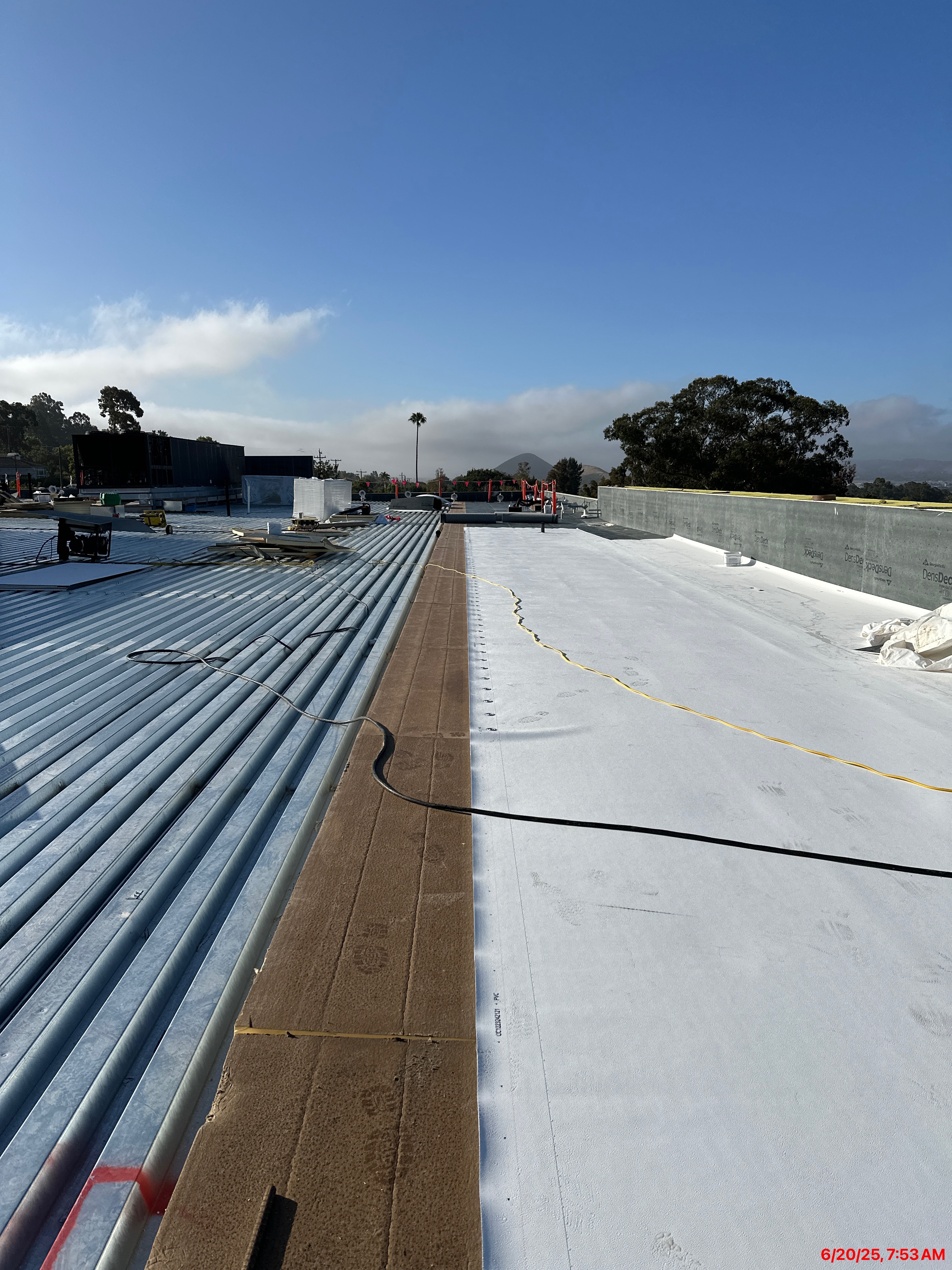 PVC roofing system installation, laid out on southwest side of roof, consists of polyvinyl chloride (PVC) sheeting rolled over a substrate of rigid 2-inch foam insulation. This highly reflective surface combined with the layer of insulation greatly reduces heat absorption.