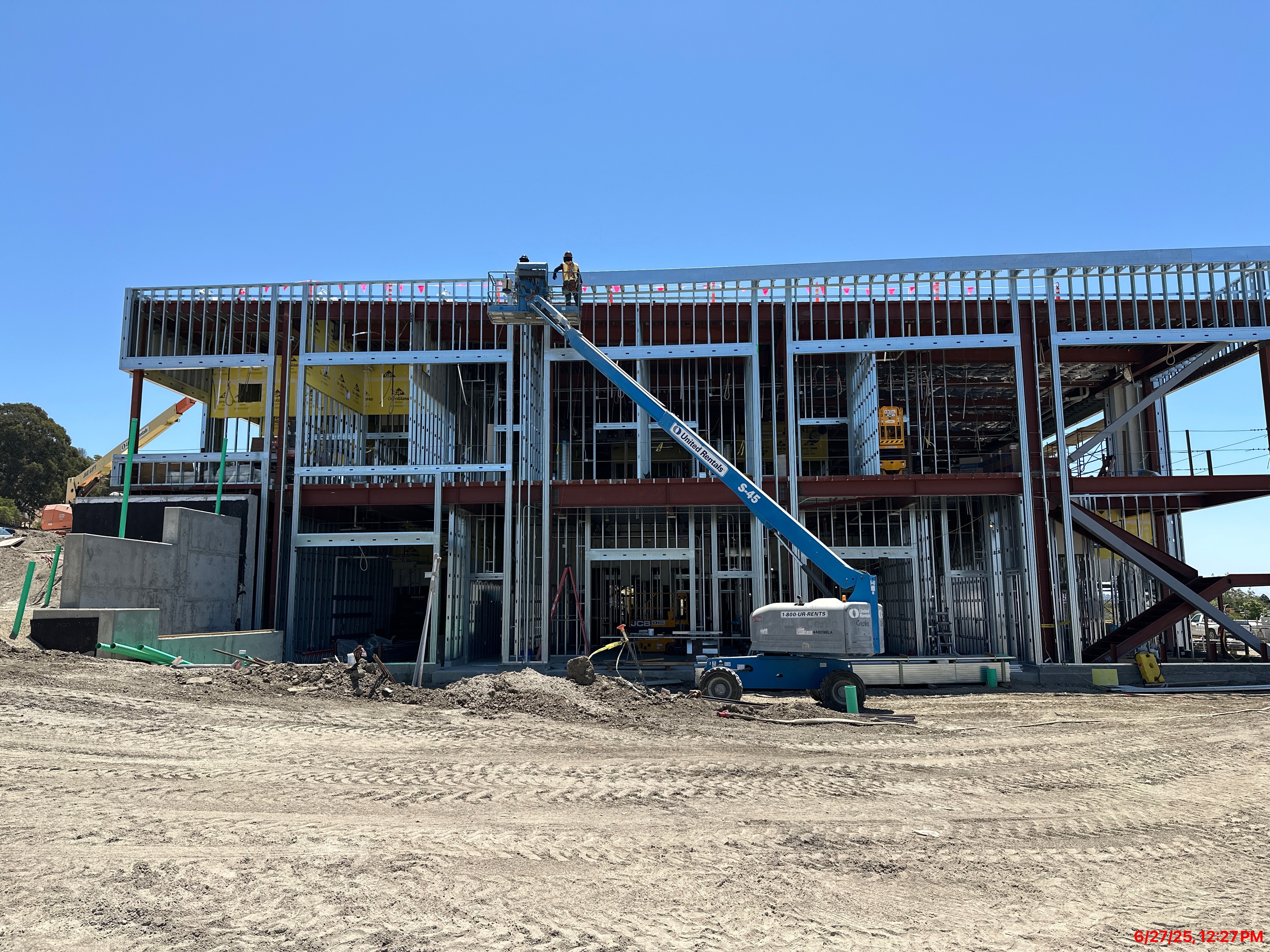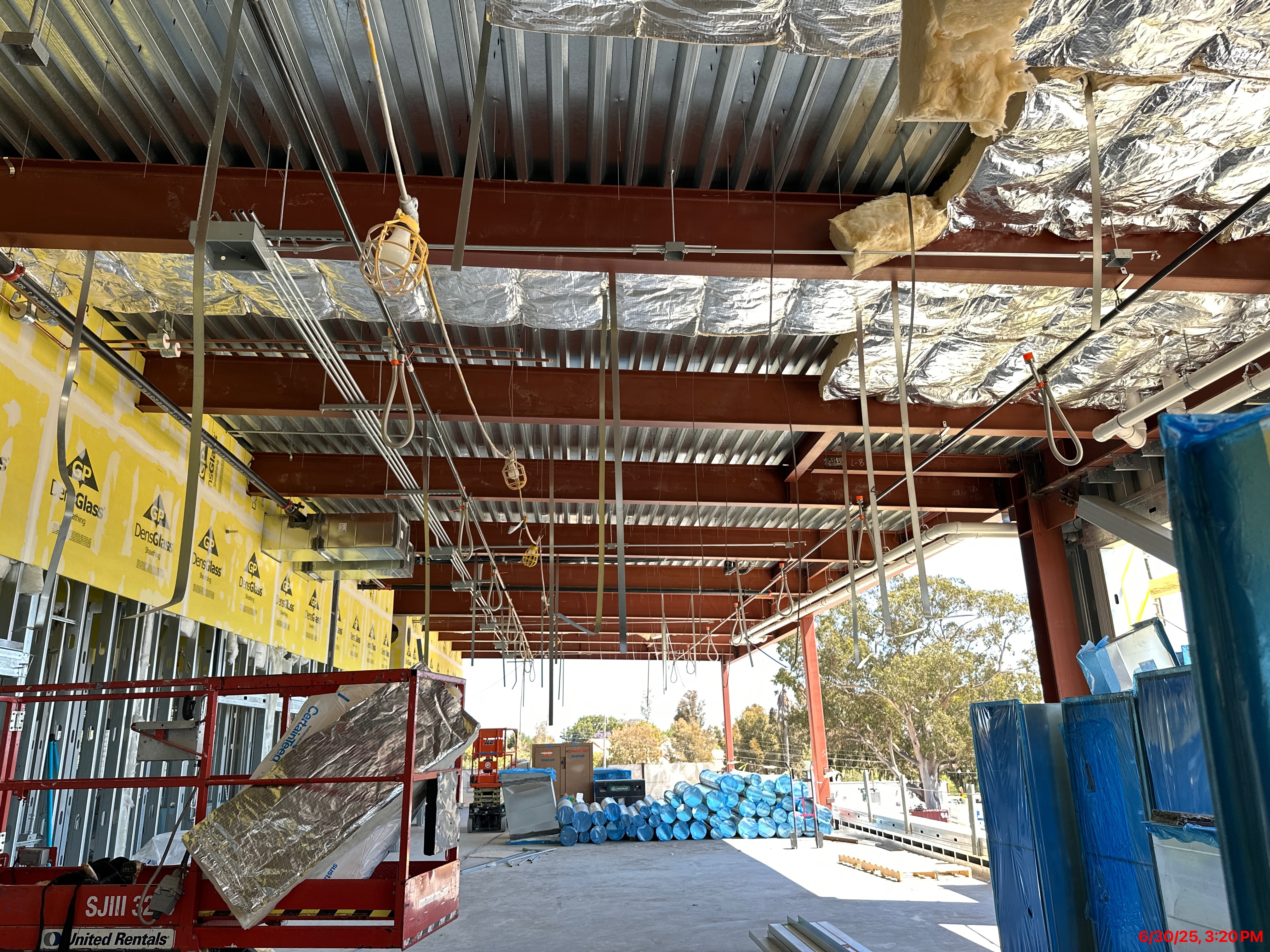 • Metal stud installation of interior and exterior walls; gypsum sheathing placement around HVAC ductwork on first and second floors, and on exterior walls