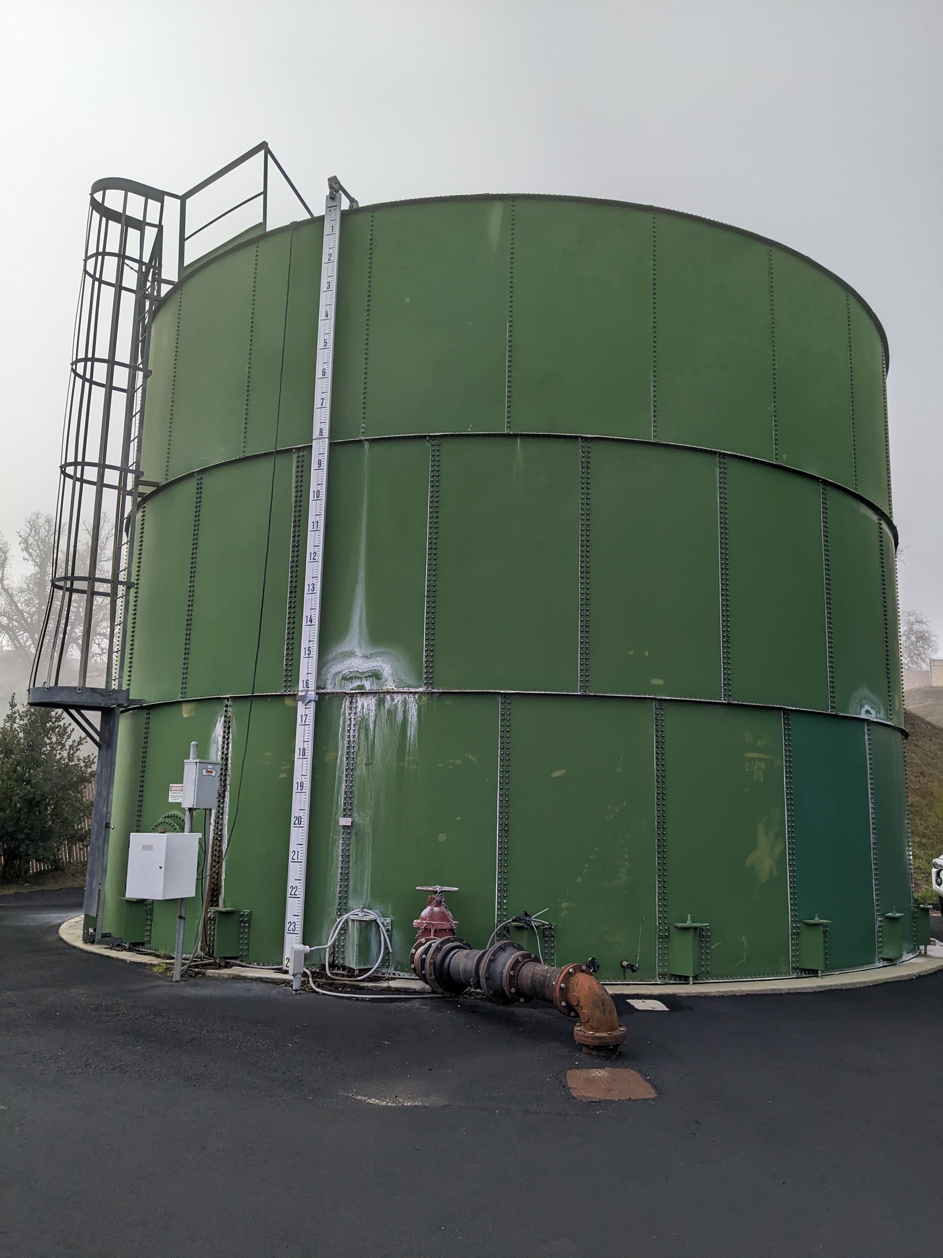 The existing water storage tank is a leaking 157,500-gallon bolted steel water storage tank. The replacement tank will be the same size and welded to extend asset life 50 years. A construction contract in the amount of $931,091 was awarded to Crosno Construction on September 24, 2024 by the Board of Supervisors. The total project cost is $1,750,000 and is funded by the American Rescue Plan Act of 2021 (ARPA). Construction began in Spring 2025 and is expected to be completed by the end of 2025.