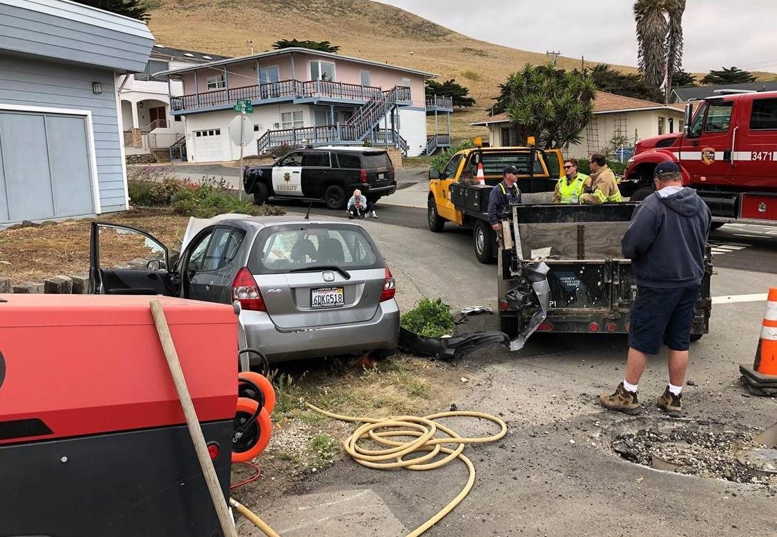 The crew members were working on a water line at the intersection of Chaney Avenue and Ocean Boulevard in Cayucos when they were struck by a vehicle that swerved off Highway 1.